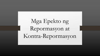 Ang Repormasyon ay isang hati sa Latin na Kristiyanong iglesya na sinimulan ni Luther noong 1517 at nagbago sa pamamagitan ng maraming iba pa sa susunod na dekada-isang. Slide 2 of 21 of Ang Repormasyon. Ano ang naging sagot ng Simbahang Katoliko sa Repormasyon.